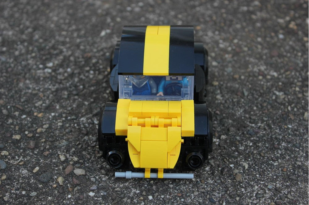 This MOC is an 8-stud wide, VW beetle built to fit 2 minifigures. Inside, there is 2 seats (driver and passenger) and stick shift with driver side steering wheel. To access the interior, all you have to do is remove the roof as seen above.