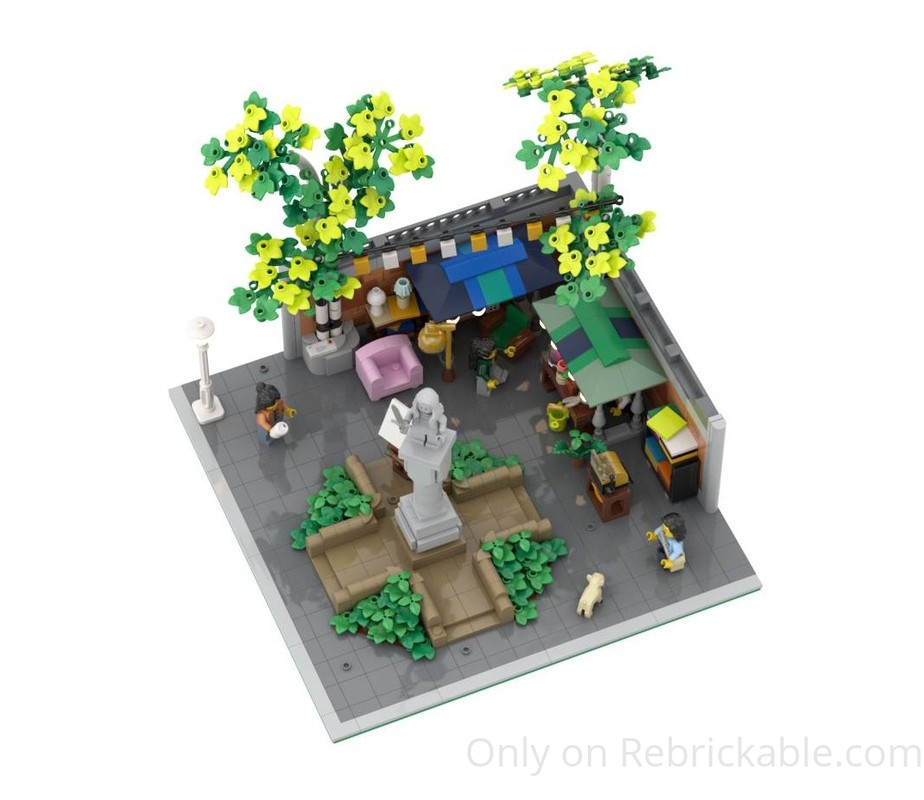 a corner square with a statue, that the community holds a weekly flea market at