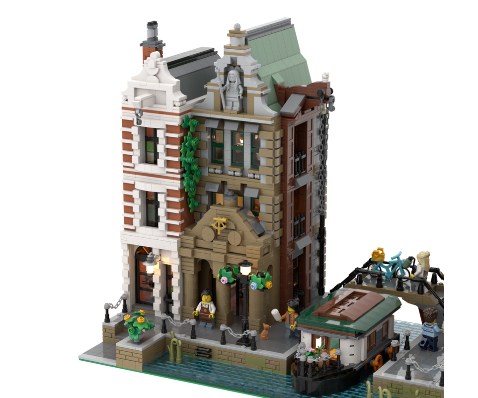 the dutch quarter consists of three buildings and a houseboat around a bridge leading minifigs over a canal![]()