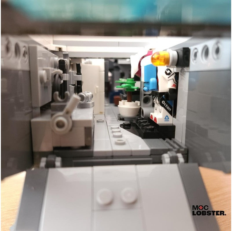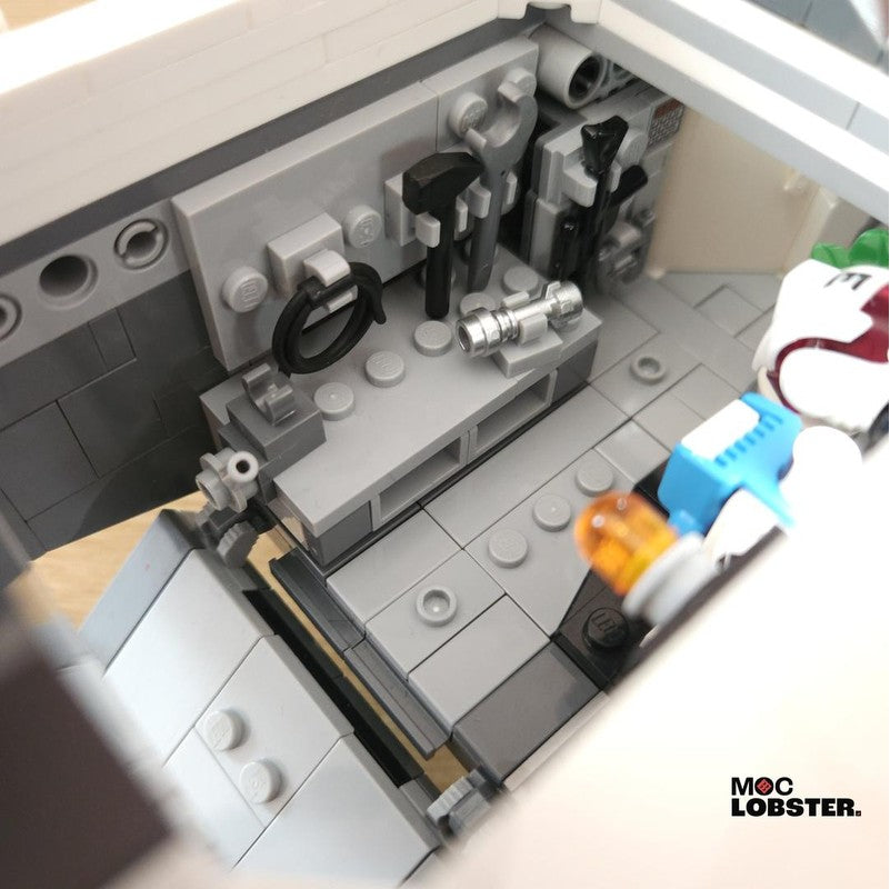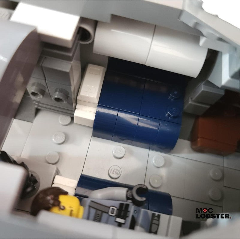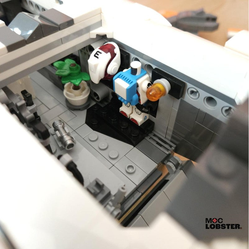 A large, sturdy exploration vessel. Has everything the figs need on onboard! Including a workbench, armour area, bathroom, sofa, kitchenette, beds and cockpit. Features working landing gear and a landing ramp at the rear of the ship. Uses a technic frame underneath, and is very easy to handle. Surprisingly 'swooshable' even with one hand, just don't pick it up by the tips of the wings!