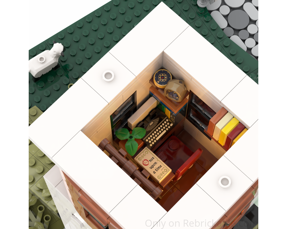 the first floor is the bedroom, a big bed next to a wood burning fireplace to keep warm at night, and some personal items on the nightstand(shelf) - above that sits a small office in the round part of the tower, with some books and journals written by the keeper and a typewriter to write the next one