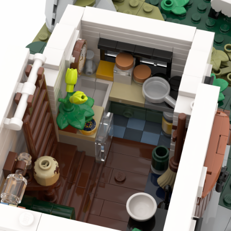 The kitchen and living room can be found on the ground floor, a cozy big chair next to some knick knacks the keeper collected over the years. A old globe, a ship in the bottle, some maps and books and an old tv.