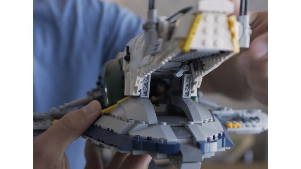 The outside footprint of the ship is very similarly structured to Lego's play scale design from 2019, but the interior is completely redesigned and reinvented to fit much more in a small space. The cockpit now seats three mini figures and there is room for two passengers below the cockpit. The passenger area swings with the rotation of the ship so that it correctly sits whether horizontal or vertical.