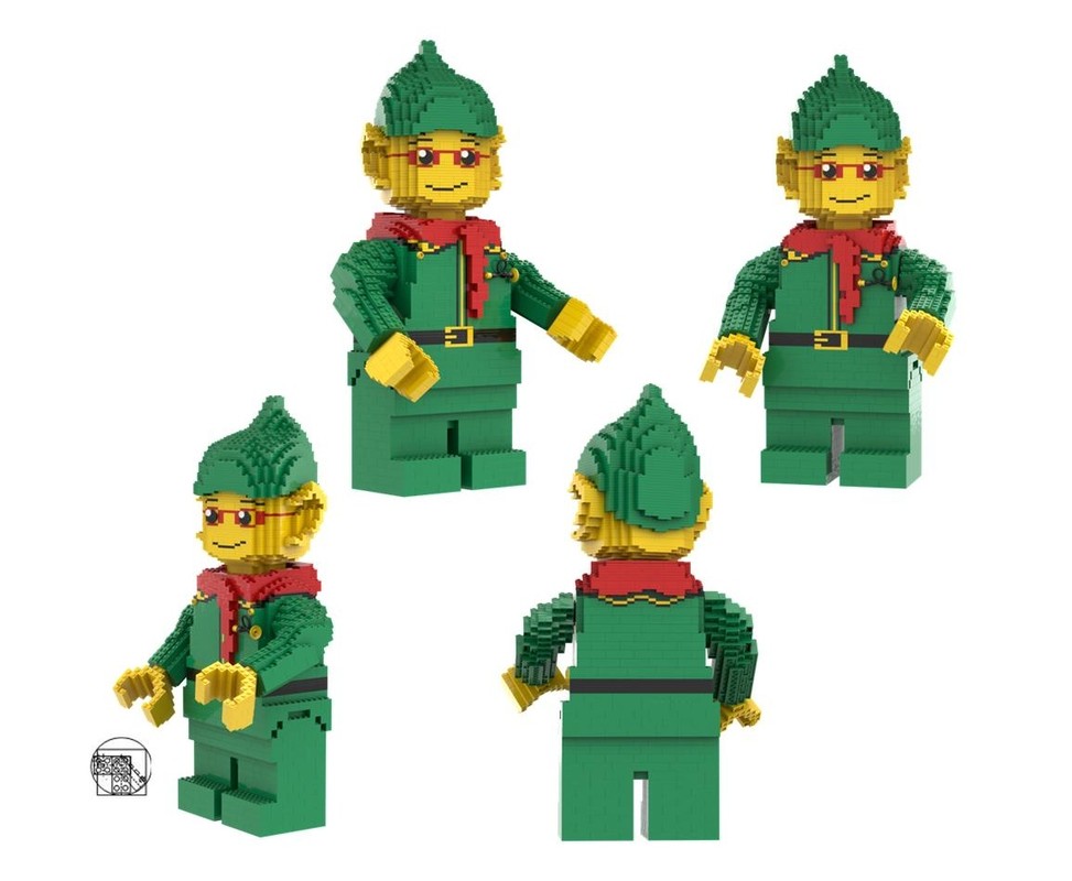 Elf with green hat, green torso with dark green scalloped collar and mail horn, red scarf, black belt, green arms with yellow hands, elf head with pointed ears and green legs.