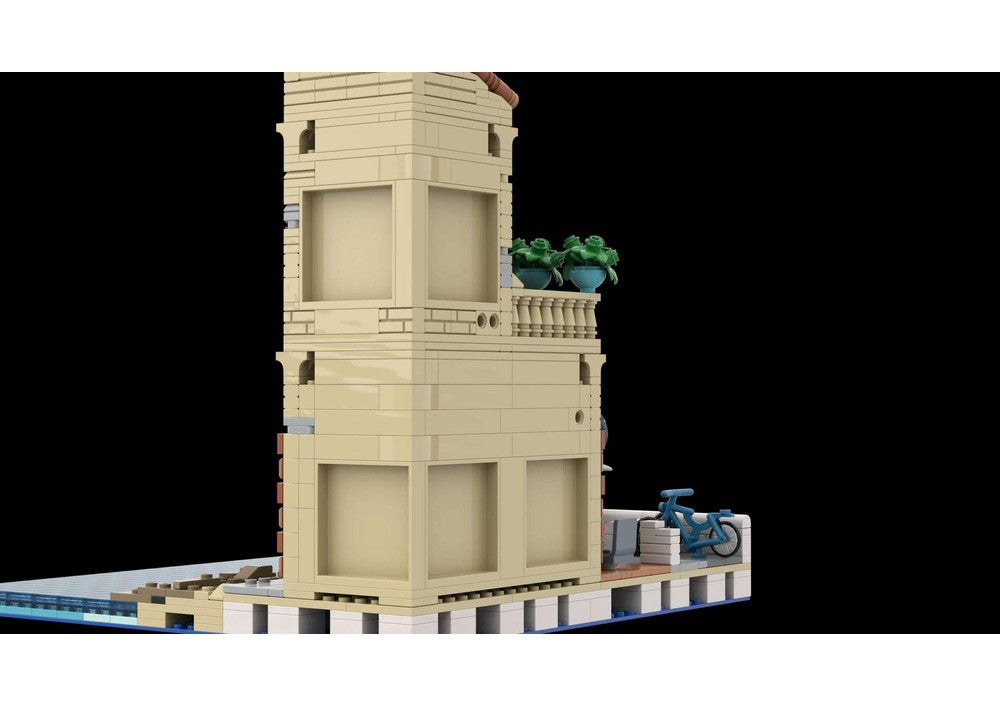 My latest rebrickable model features a customizable two-story building complete with outdoor terrace and terracotta roof! Also included is a full beach, outdoor patio, beach shower, bike rack, and of course some ivy! The build is designed to be modular so the building can be removed from the plate. The technic bricks are optional if you want to run wires through the building.
