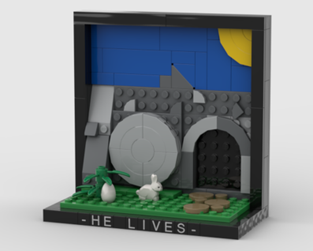 This MOC is a simple display of Jesus’s empty grave after he rose from the dead, including a bunny and even a little white egg.