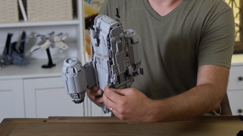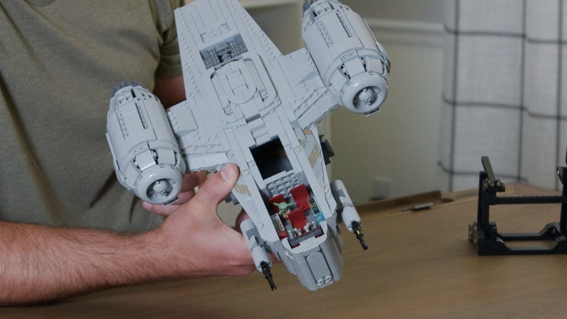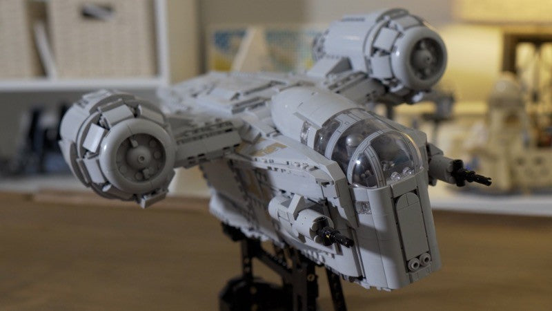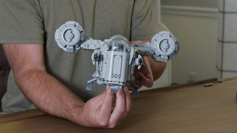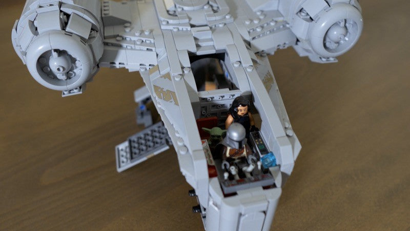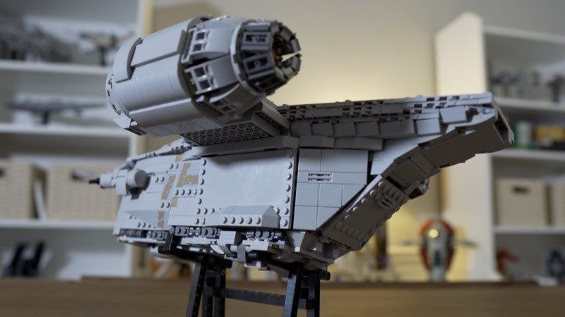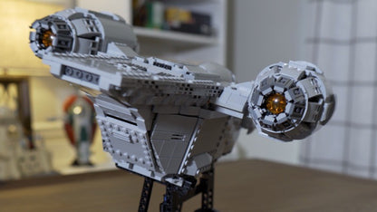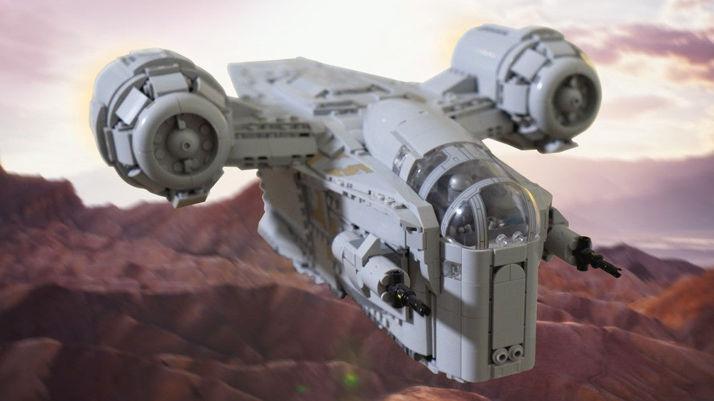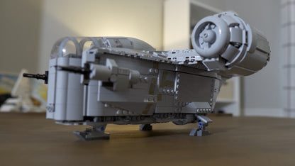 This MOC is a heavy modification of the 2020 Lego Razor Crest, set 75292 from the Mandalorian, but rivals the UCS Razor Crest, 75331, in details and accuracy. It has a full cockpit that now seats three minifigures and the landing gear is completely retractable for great play and posing functionality. The exterior features lots of tiling and minimal studs while the interior has plenty of space for passengers and cargo. All YELLOW PIECES can be substituted for any color.