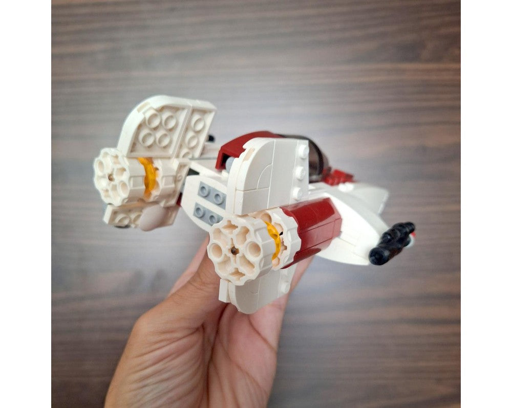 The RZ-1 A-wing interceptor was a starfighter used by the Rebel Alliance, and one of my favorite Star Wars ships. It's a tiny spaceship, but it can be a real menace, as seen in Return of the Jedi when Arvel Crynyd took out a Super Star Destroyer by crashing his A-Wing through its bridge, arguably accidentally. Most MOCs of this ship, however, tend to be a bit oversized, as it's difficult to achieve its characteristic angles with LEGO pieces. In this version I tried to address that, by making use of a new wedge piece to achieve something close to the proper shape while also keeping the model very small.