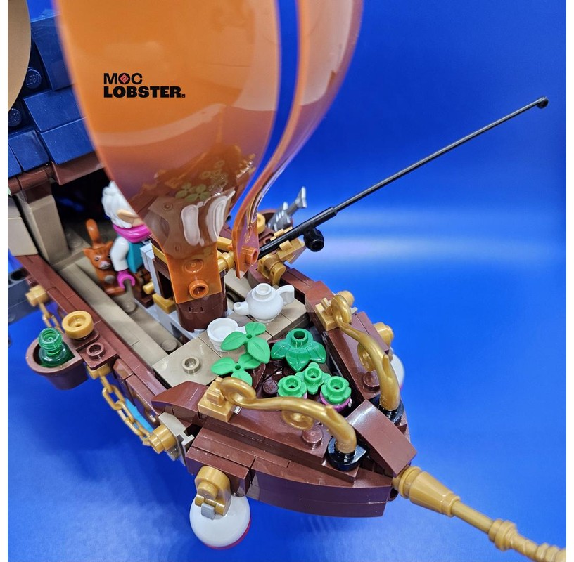 The Drunken Sailor - A flying ship used mainly for fishing. The stand is quite minimal, if you're intending on placing figs or modifying the ship at all, remove if from the stand first, and re-attach it once you're ready to display it again as It isn't designed to have a lot of pressure at either end of the ship while attached.