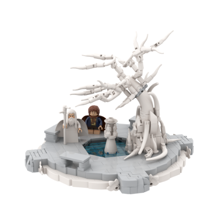a moc of gandalf and pippin arriving at minas tirith - showing the fountain and tree of gondor, now leaveless and dying - on a white display base